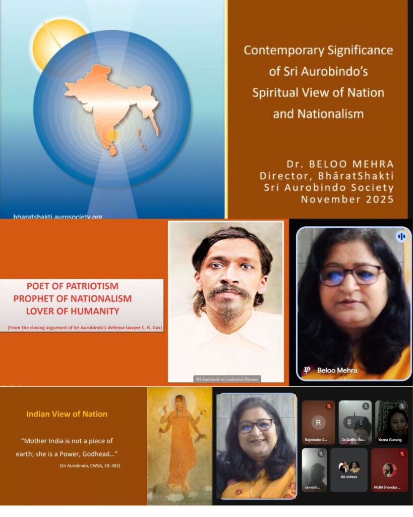 Each of the sessions during this 2-week Certificate Course designed for college and university educators was focused on a different topic delivered by an expert on the subject-matter. As part of this course, Dr. Beloo Mehra, Director, BhāratShakti, was invited to deliver one session on 18th November on the topic – Contemporary Significance of Sri Aurobindo’s Spiritual View of Nation and Nationalism.
