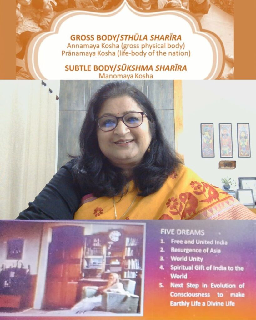Towards the close of the session, Dr. Mehra spent a few times on highlighted the essential points from Sri Aurobindo’s message broadcast on August 14, 1947, in which he spoke of five dreams: A free and united India; Resurgence of Asia; World unity; India’s spiritual gift to the world; and the next step in evolution of consciousness which would make earthly life divine. She concluded with the thought that Sri Aurobindo had warned against narrow politics. For him, the core work of nationalism was to recover India’s essential thought, character, and energy to solve global problems from an Indian standpoint.