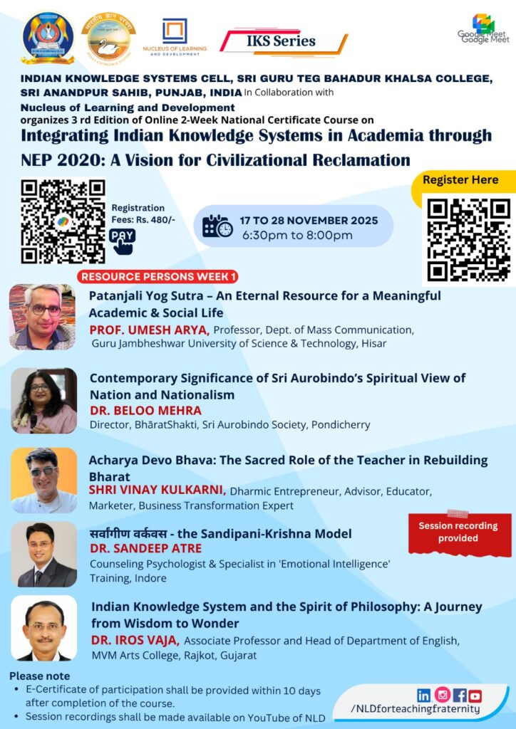 Indian Knowledge Systems Cell, Sri Guru Teg Bahadur Khalsa College, Sri Anandpur Sahib, Punjab, in Collaboration with Nucleus of Learning and Development organized their Third Edition of Online 2-Week National Certificate Course on “Integrating Indian Knowledge Systems in Academia through NEP 2020: A Vision for Civilizational Reclamation” from