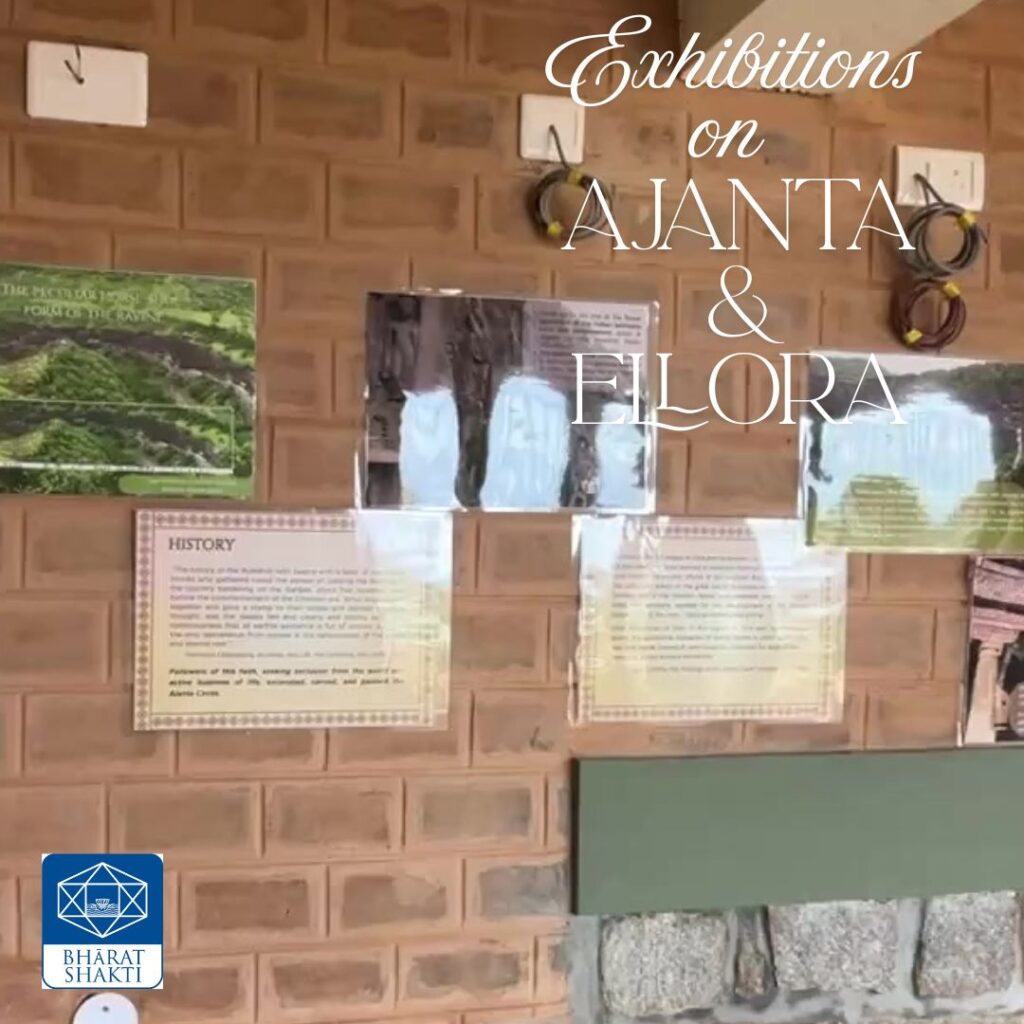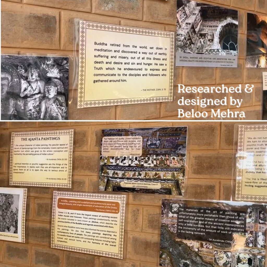 As part of the Invoking Shakti: Kala, Sanskriti evam Sadhana workshop BhāratShakti department was invited to design and conduct for 375 students of Creative School, Bengaluru, Dr. Beloo Mehra researched and curated a 150-poster extensive exhibition on Ajanta and Ellora. This work involved going through a large body of photographers from her own collection of her visit to these two places some years back, selecting the right photographs, editing them and organising them in an order so that they convey a narrative that children of ages 14 onwards can easily follow. Relevant text to go with the photos was researched and curated by Dr. Mehra after going through a wide range of texts including Sri Aurobindo’s essays on Indian Art and Culture.