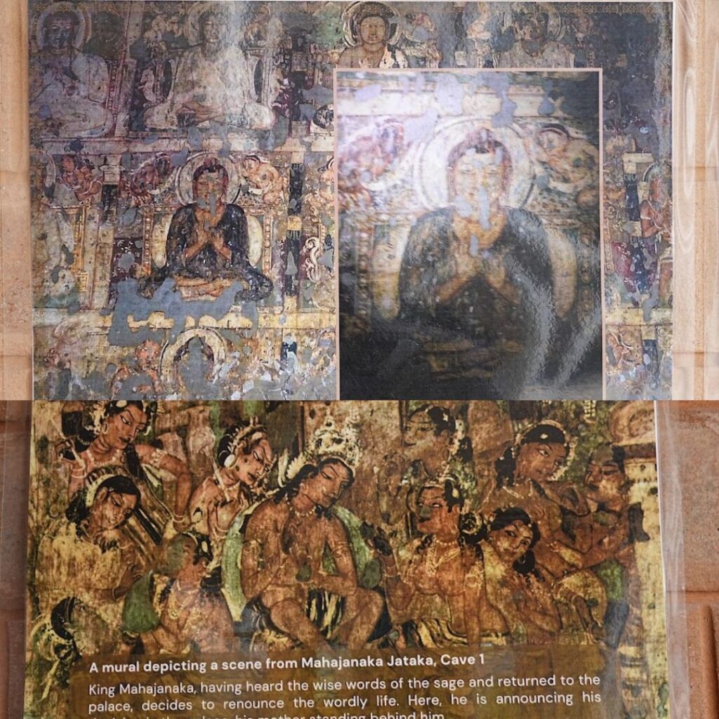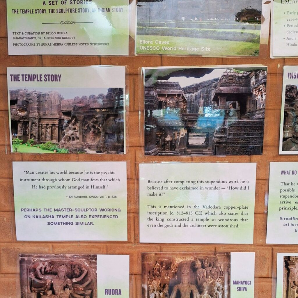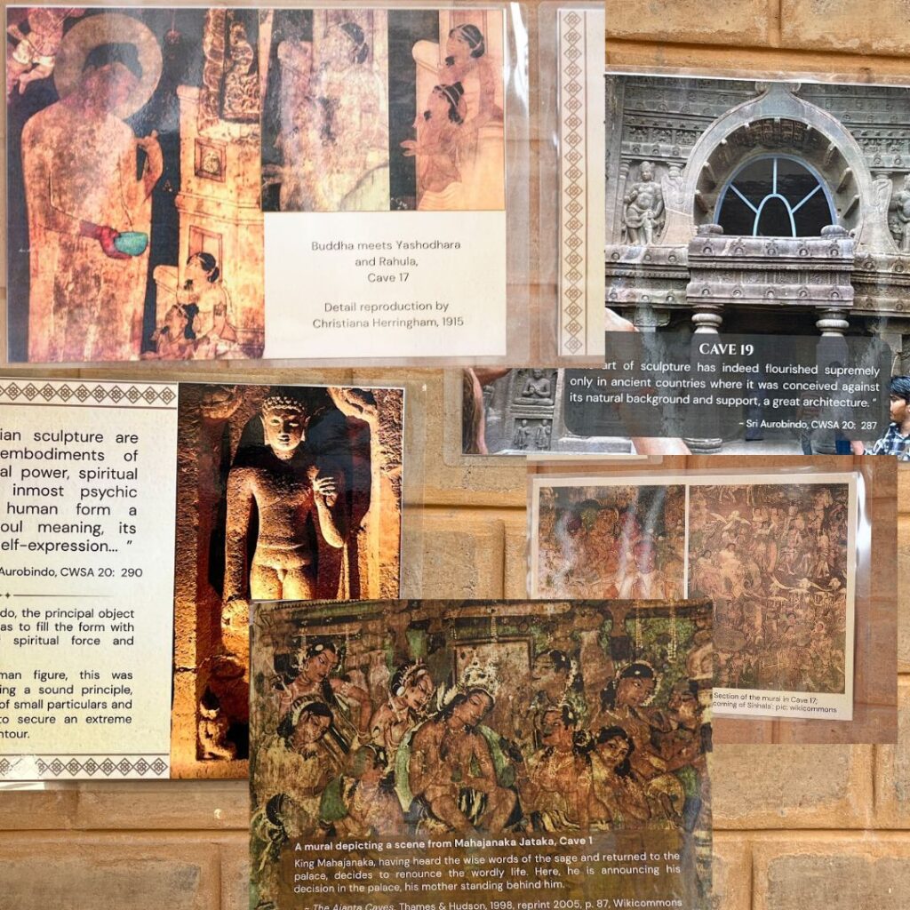 The Ajanta exhibition (87 posters in total) titled, “A Brief Study of Ajanta” starts with a general overview of how in the light of Sri Aurobindo one should approach places of such deep cultural and historical significance such as Ajanta. Relevant quotes of Sri Aurobindo – sometimes broken down in smaller, easy-to-understand phrases – were incorporated as text posters in the exhibition. The narrative of the exhibition includes a few specific details and facts about when the Ajanta caves were exhibited, the dynasties who sponsored such large-scale work, the cultural-historical context in which these Buddhist monasteries and worship halls were built. Some information about the deeper meaning of ‘cave’ in the context of its psychological-spiritual significance for inner journey was also creatively included in the exhibition along with some relevant photographs.