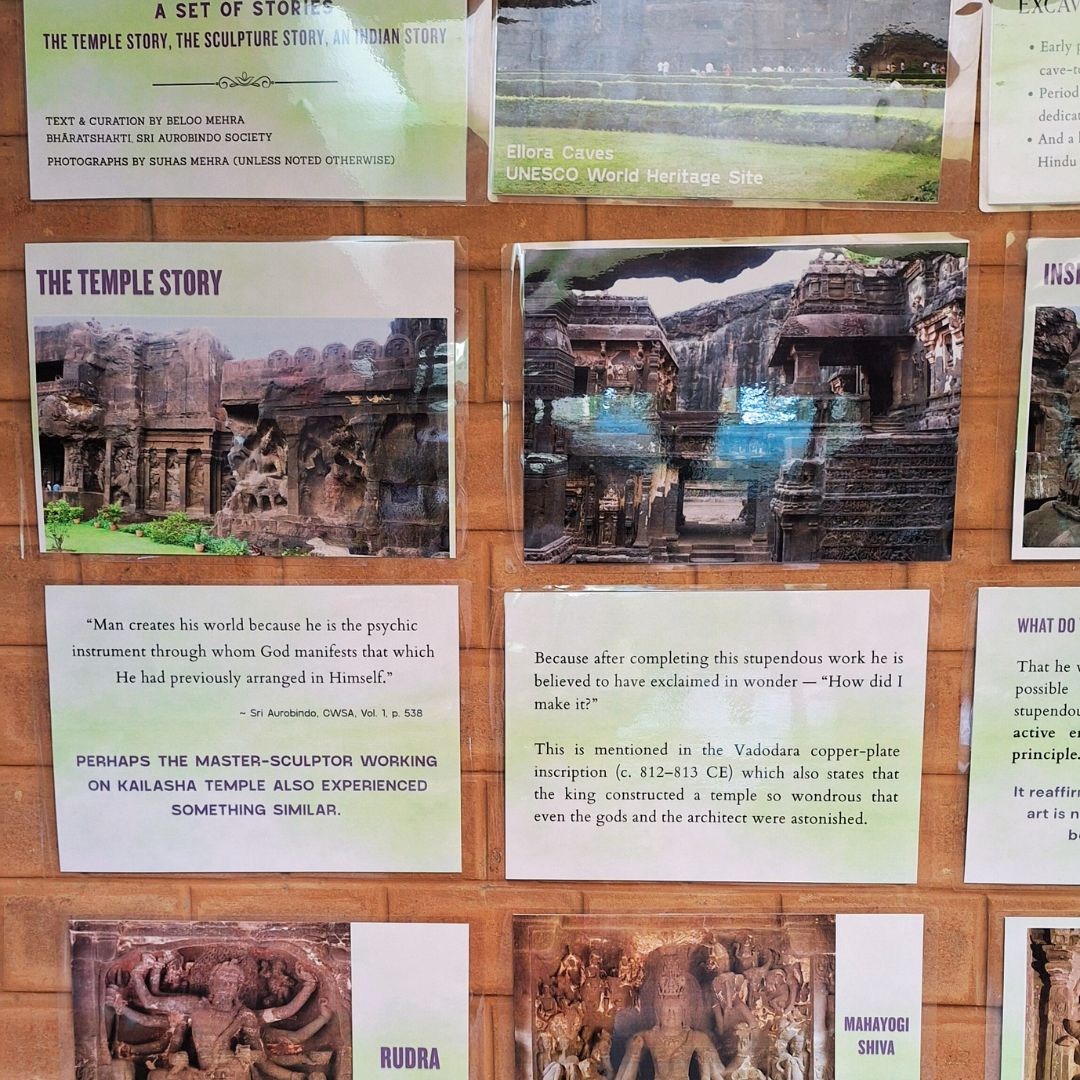 The Ellora Exhibition (63 posters) has been curated somewhat differently – this was done to help students go deeper into a specific cave at Ellora, namely, Cave 16, the Kailasha temple. The idea was to faciliate students’ understanding that India’s long and rich sculptural tradition is closely connected with her temple architectural tradition, known together as vaastu parampara. The exhibition shows that this intimate connection between these two art forms is exemplified perfectly by Kailasha Temple at Ellora caves. Additionally, an experiential account of Dr. Mehra’s visit to Kailasha temple and other caves of Ellora also makes an important part of this exhibition.