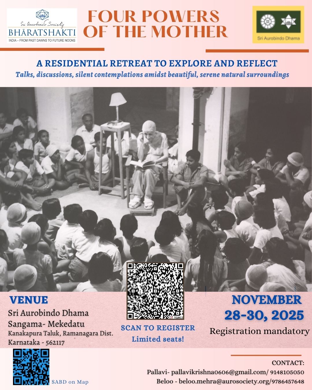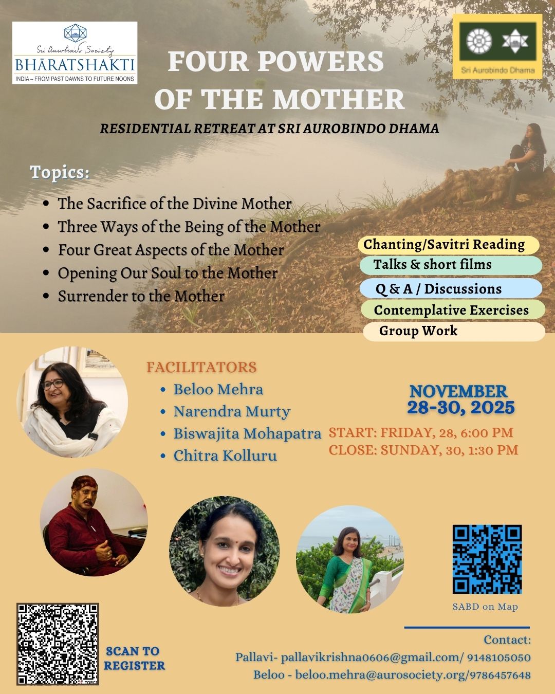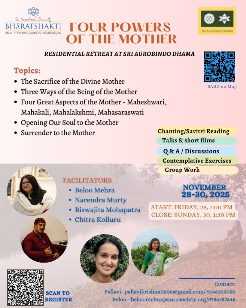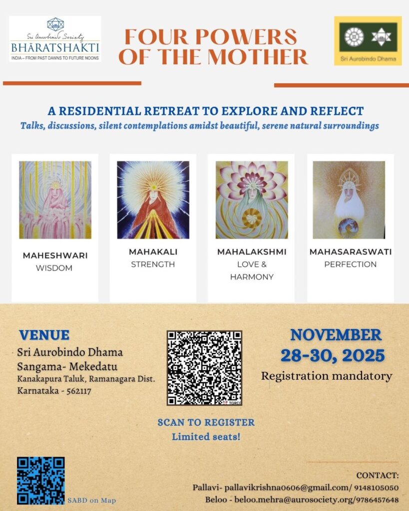 The BhāratShakti team will be conducting a two-day immersive workshop-retreat on the topic – Four Powers of the Mother. The residential programme will be hosted by Sri Aurobindo Dhama located in the serene and beautiful natural surroundings at the banks of Kaveri river in Sangama-Mekedatu in Kanakpura, Karnataka.