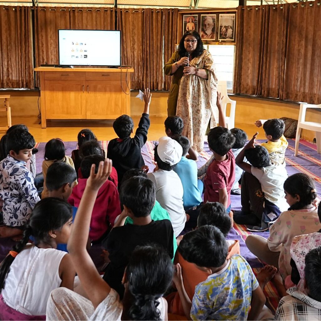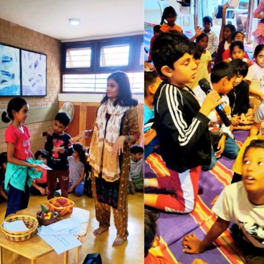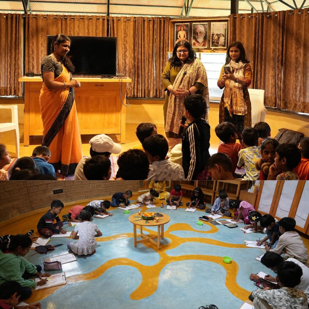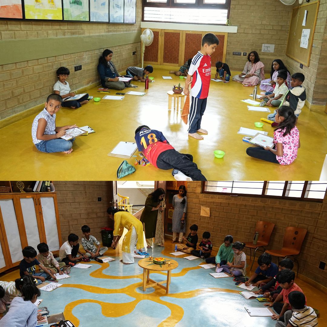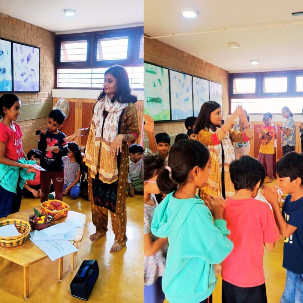 The workshop conducted on September 12, 2025 focused on providing an experiential understanding to the young students of selected aspects of the spirit and forms of Indian art and art appreciation. A range of age-appropriate learning activities for the young children were designed including: storytelling sessions, chanting sessions, crafts activities, practice sessions, short performances and cultural activities. The workshop planning and organization team from BhāratShakti comprised of Dr. Beloo Mehra, Director; and Ms. Biswajita Mohapatra, Research Assistant. The team worked intensively on a number of details for the workshop, in discussions with Ms. Dhivya Naren, Principal of the Creative School. Many teachers from the school were a great help in helping with the workshop organisation and managing the logistics throughout the day with the children’s groupings and other arrangements.
