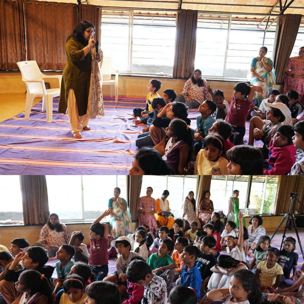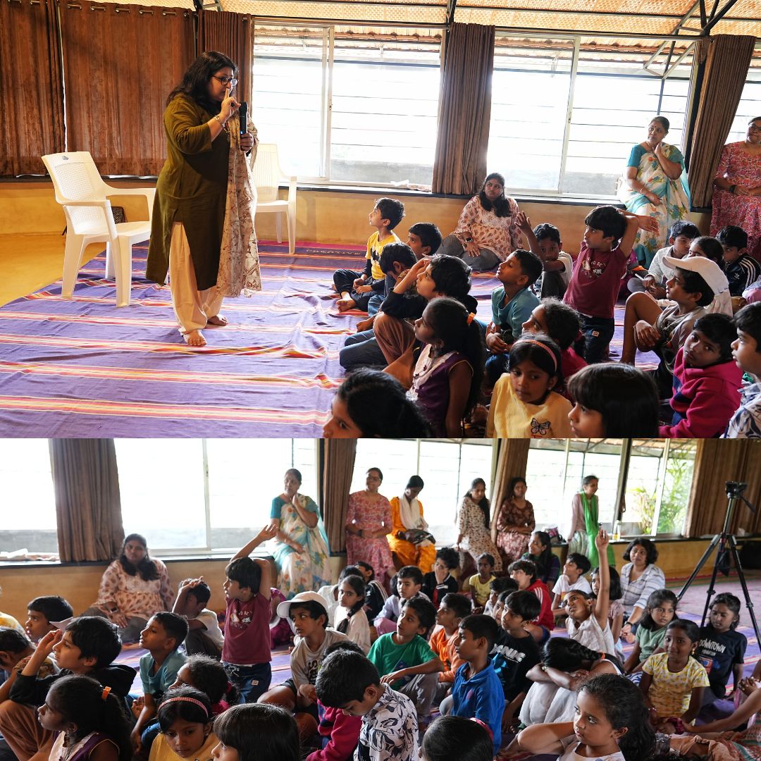 The day began with a chanting session in which all the children and teachers along with us chanted Gayatri Mantra from the Rigveda and Sri Aurobindo’s Mantra Om Anandmayi Chaitanyamayi Satyamayi Parame. Dr. Mehra then also taught the children a simple shloka from Hitopadesha – which speaks of the idea of Vasudhaiv Kutumbakam. She explained the meaning of the shloka and the children and teachers repeated the mantra a few times. Dr. Mehra said that she will take up that mantra for deeper learning during the next year’s Invoking Shakti workshop, and by briefly introducing them to this shloka she intended to raise the curiousity.