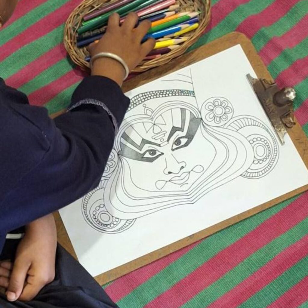 The younger children were asked to colour some sketches which highlighted motifs and themes from various forms of Indian art including diverse painting styles of India, Indian dances, Indian musical instruments and more. This activity was also practiced in silence to inculcate the value of concentration while doing any work. Soft music was played in the background to help children concentrate. Another activity included cultivating an awareness of Navarasa with small flash cards on each of the rasa-s. This activity also included practicing different expressions related to different emotional states, or rasa-s. Children found this activity highly engaging and participated with lot of joy, especially when they were learning about Hasya rasa.