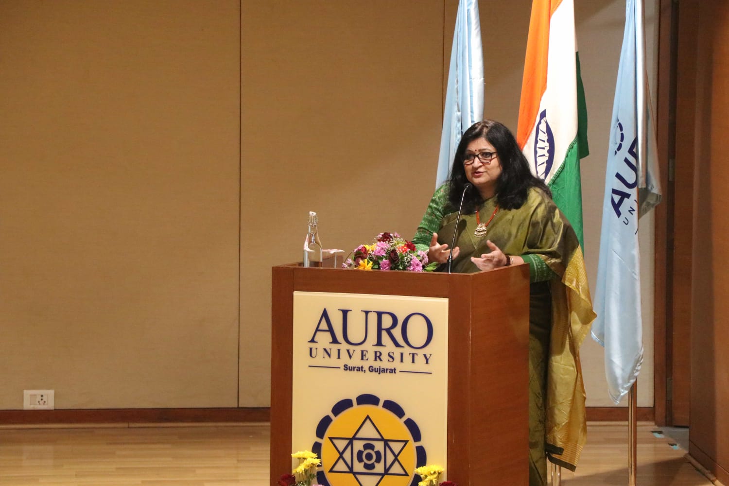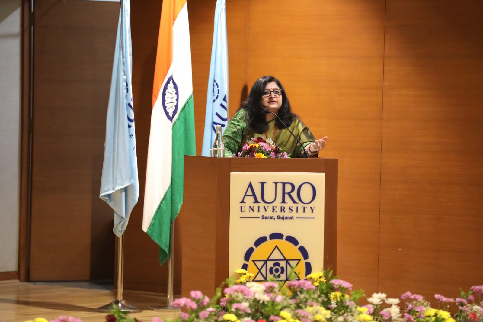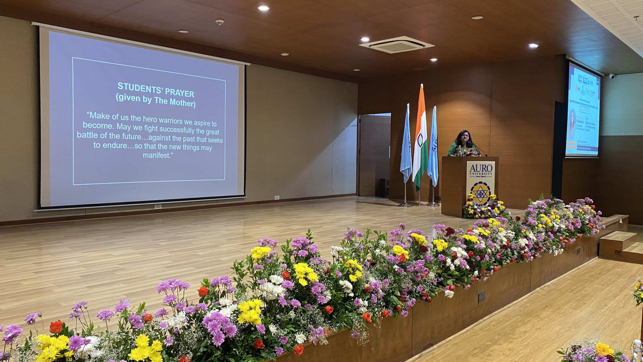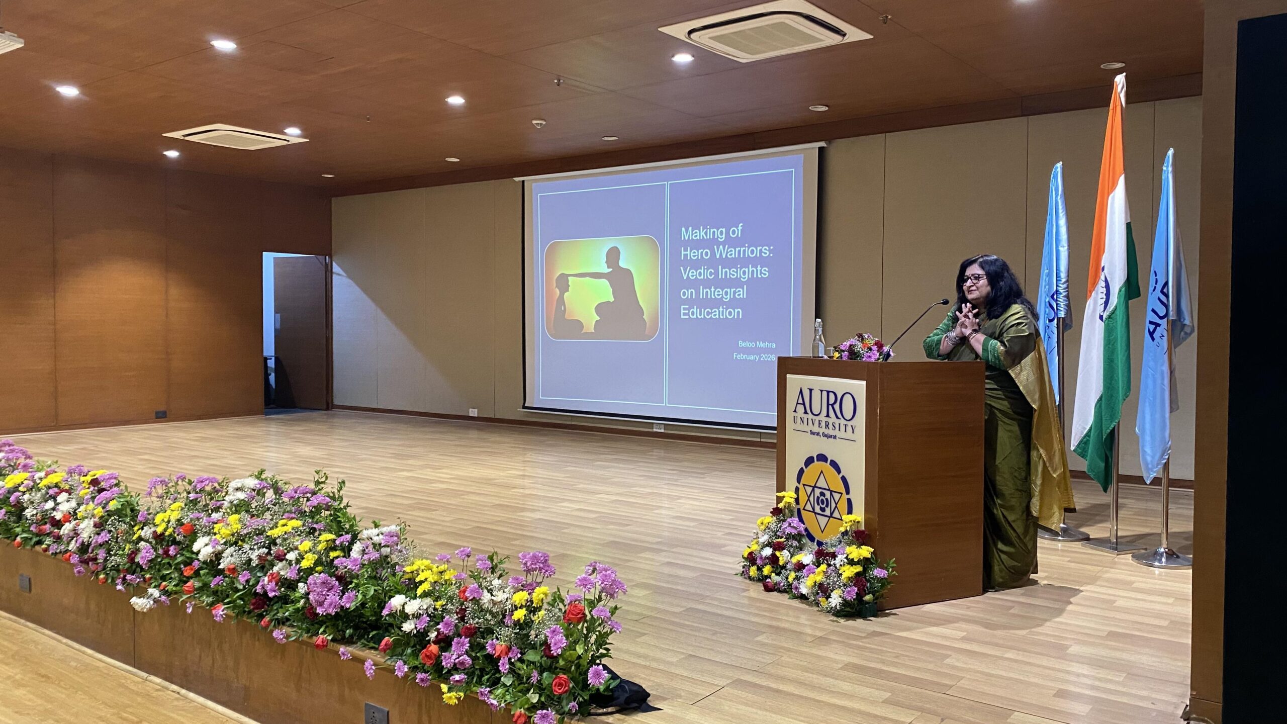 During February 12 to 15, 2026, an International Conference on Discovery and Application of the Vedic Knowledge (February 12-15, 2026), organised by Auro University in collaboration with Sri Aurobindo Integral Life Center, Surat, La Grace Sri Aurobindo Integral Life Center, USA, Bṛhat Foundation, BhāratShakti, Sri Aurobindo Society, SAKSHI Trust, Bengaluru and AuroChit, USA, was held at the campus of Auro University. Dr. Beloo Mehra, Director, BhāratShakti, SAS, was invited as a keynote speaker and representative of a collaborating institution.