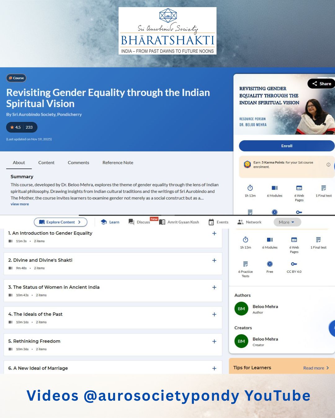 The video content (6) and reference materials (3) for this course, researched and delivered by Dr. Beloo Mehra, explores the theme of gender equality through the lens of Indian spiritual philosophy. Drawing insights from Indian cultural traditions and the writings of Sri Aurobindo and The Mother, the course invites learners to examine gender not merely as a social construct but as a manifestation of a deeper spiritual truth.