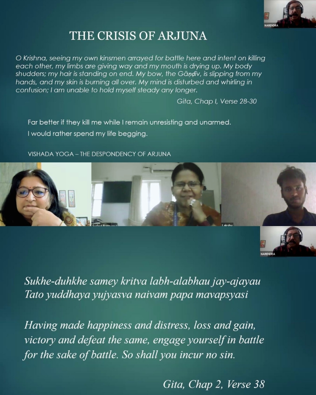The course topics were carefully researched and outlined by Narendra Murty with the starting premise being Bhagavad Gita as the greatest “self-management manual” in the world. It is the “Krishna cure”for the “Arjuna disease.” He explained in the first introductory session of the course that at some point in our lives we all suffer from the “Arjuna disease” when we feel paralyzed and overwhelmed by the challenges of our lives. Managing ourselves comes before we can think of managing others and the situations of the external world. And when our own knowledge and inner resources prove inadequate, we turn to the Divine guidance of Sri Krishna. Following specific topics were covered in the course: