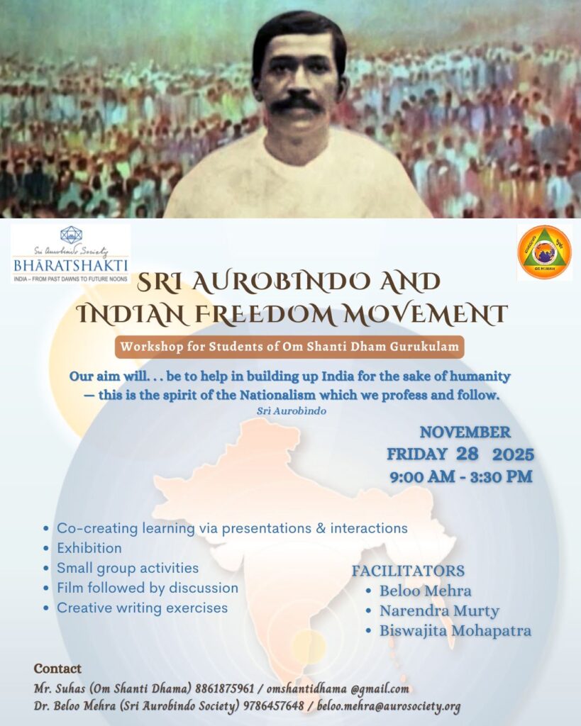 The BhāratShakti team will be conducting a day-long workshop for about 60 students of ages 14 to 16 who are enrolled at Om Shanti Dham Gurukulam. The theme of the workshop is – Sri Aurobindo and Indian Freedom Movement. This workshop is designed to give students an overview of the key ideals and ideas which were at heart of Sri Aurobindo’s phenomenal revolutionary work during his political life from 1893 to 1910. These include: