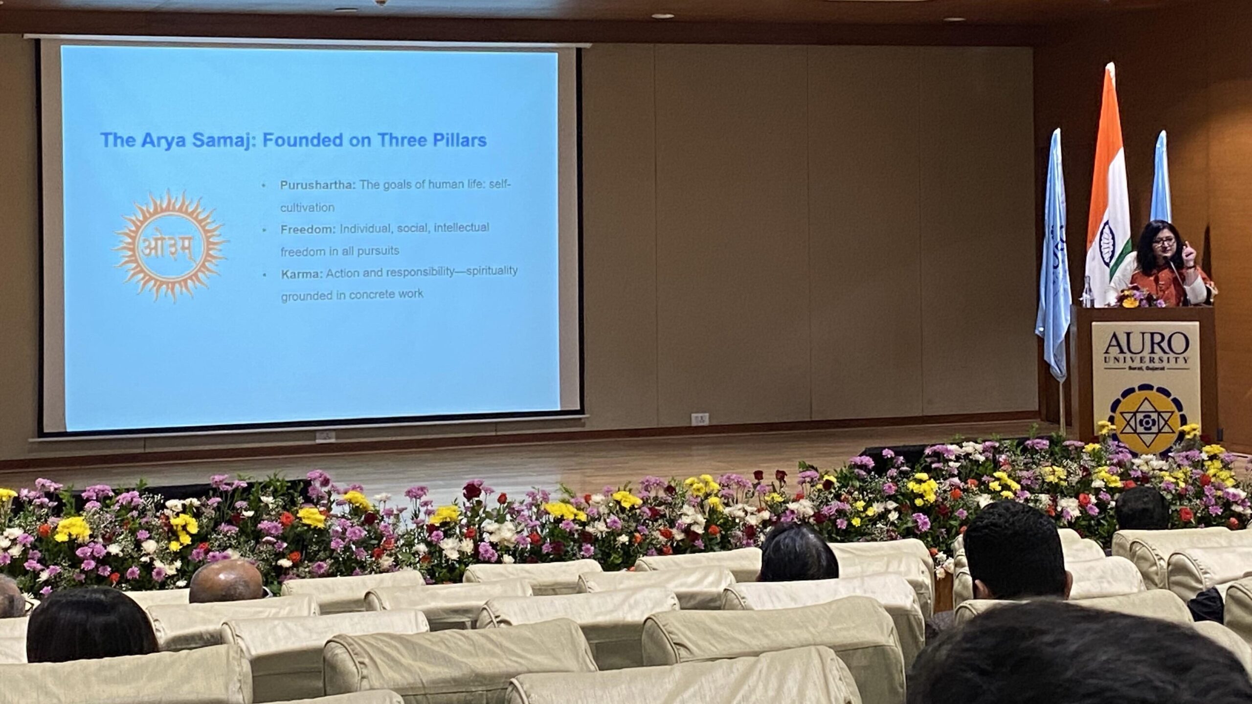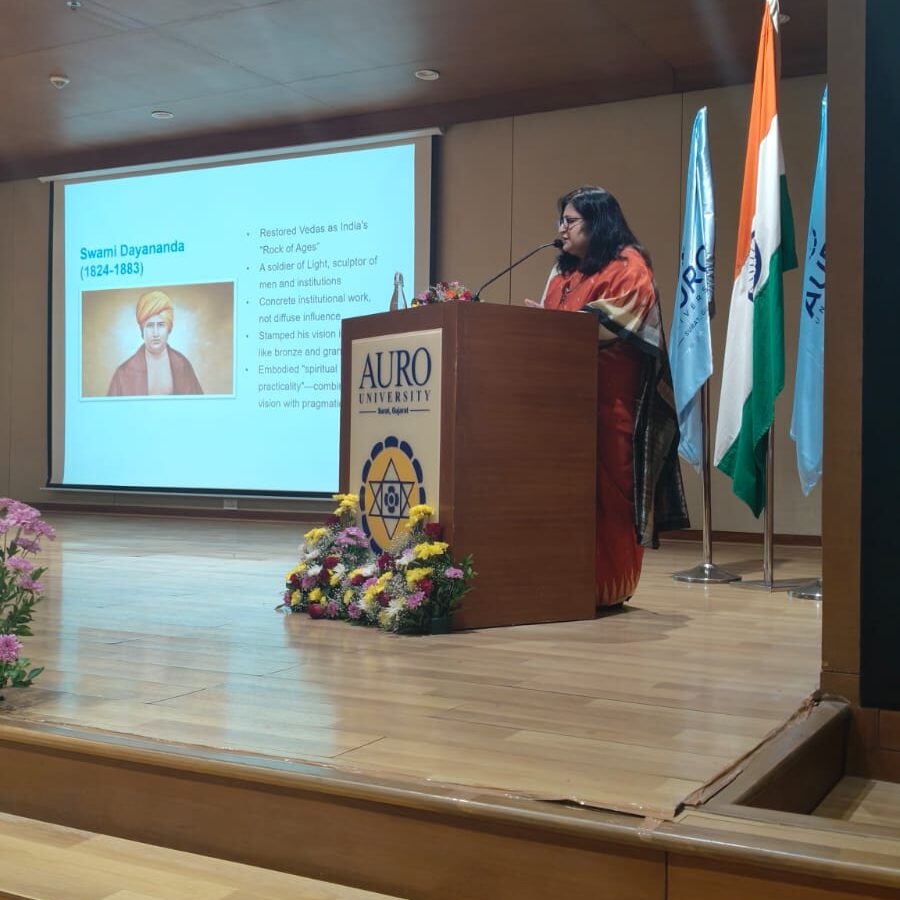 At the International Conference on Discovery and Application of the Vedic Knowledge (February 12-15, 2026), organised by Auro University in collaboration with Sri Aurobindo Integral Life Center, Surat, La Grace Sri Aurobindo Integral Life Center, USA, Bṛhat Foundation, BhāratShakti, Sri Aurobindo Society, SAKSHI Trust, Bengaluru and AuroChit, USA, Dr. Beloo Mehra, Director, BhāratShakti, SAS, was invited to deliver a special lecture on the first day of the conference. The conference opened on February 12, the birth anniversary of Swami Dayananda Saraswati (1824-1883), and Dr. Mehra had the special privilege to speak to honour the legacy of this great son of Mother India.