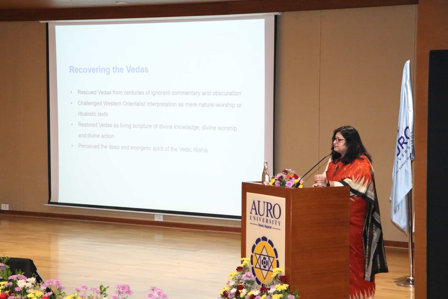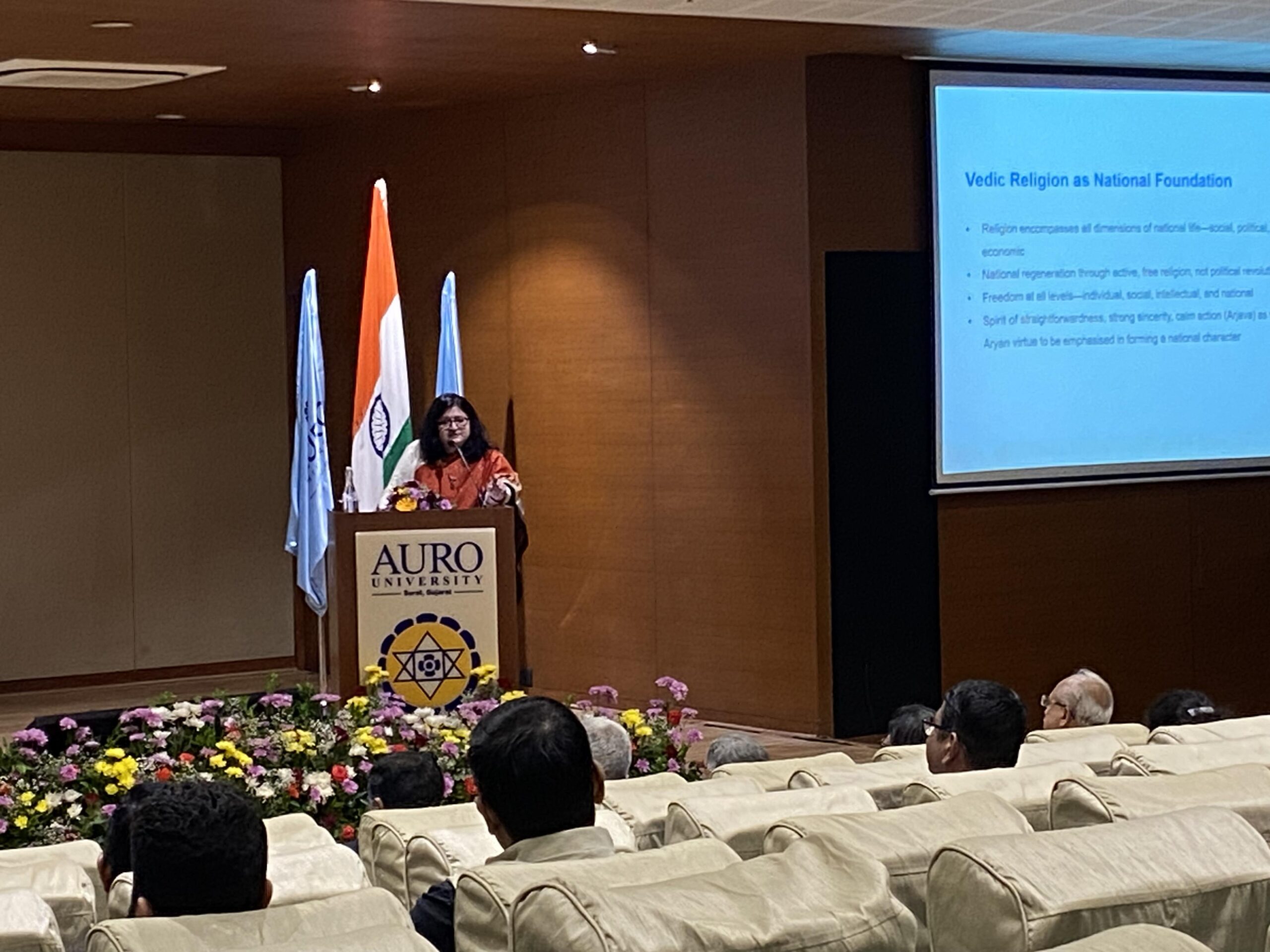 At the International Conference on Discovery and Application of the Vedic Knowledge (February 12-15, 2026), organised by Auro University in collaboration with Sri Aurobindo Integral Life Center, Surat, La Grace Sri Aurobindo Integral Life Center, USA, Bṛhat Foundation, BhāratShakti, Sri Aurobindo Society, SAKSHI Trust, Bengaluru and AuroChit, USA, Dr. Beloo Mehra, Director, BhāratShakti, SAS, was invited to deliver a special lecture on the first day of the conference. The conference opened on February 12, the birth anniversary of Swami Dayananda Saraswati (1824-1883), and Dr. Mehra had the special privilege to speak to honour the legacy of this great son of Mother India.
