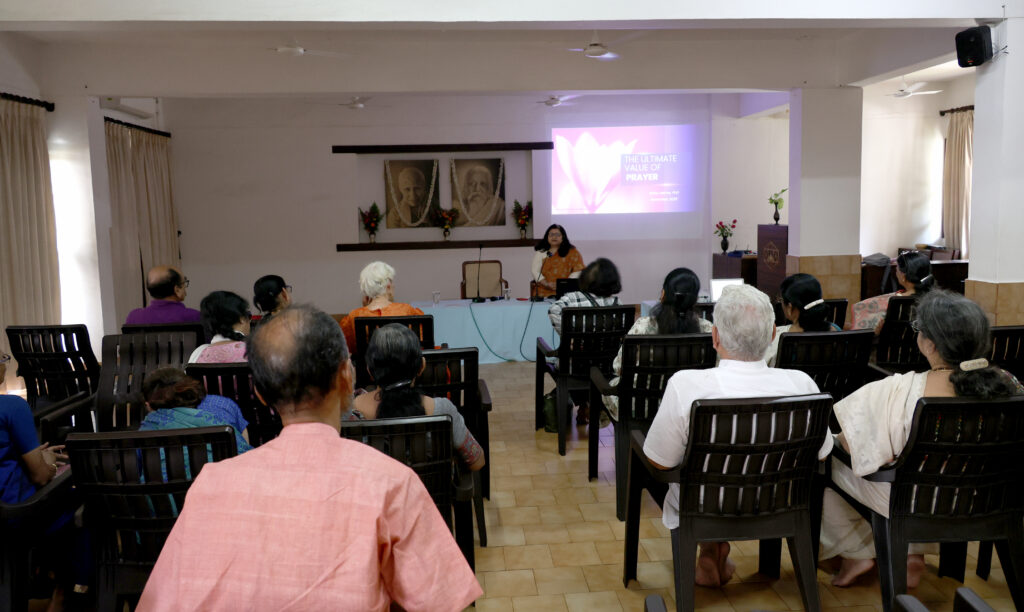 She read out Sri Aurobindo’s prayer in Alipore prison to highlight that his was a prayer of complete self-giving for a selfless cause. Prayer, when practiced with sincerity and depth, can enable the individual to transcend egoic limitations and progressively lead him or her to profound inner transformation.