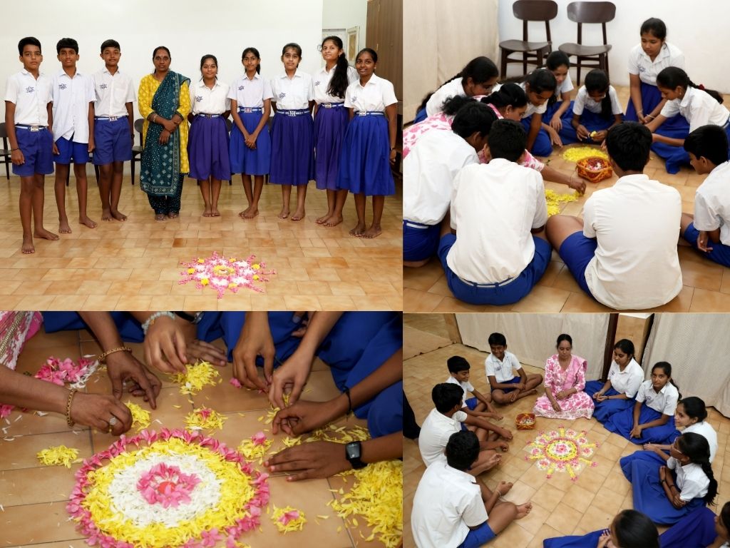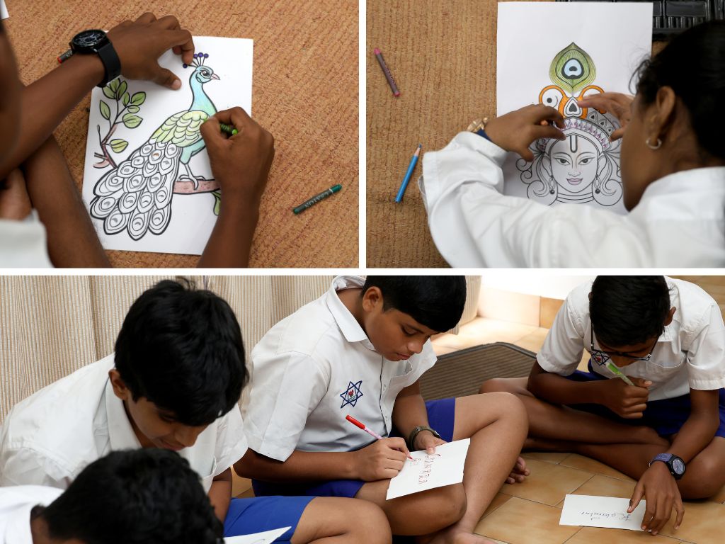 For the next activity, the students were divided into 5 groups and each group was given different activities such as colouring, drawing, Flower Arrangements and writing the names of the nine forms of Devi using their own creativity. All the activities were explained as part of the group’s celebration of Navaratri. The patterns used for colouring and drawing activities were primarily drawn from Indian cultural traditions. After completing their work, all the students were encouraged to see and appreciate the creativity of other groups.