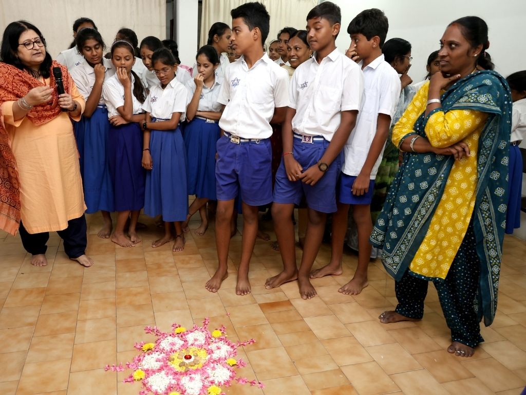 Participants included 50 students from Class VII to Class X along with 10 teachers. The event was proposed by Ms. Lakshmijyothi C., a BhāratShakti resource person, who also organises Integral Education workshop for the teachers of Sri Aurobindo Centenary School. Dr. Beloo Mehra finalised the workshop details in discussion with Ms. Biswajita Mohapatra keeping in the mind the age-group of the students. It was ensured that different cultural practices related to Navaratri are included in the short workshop — from rangoli/kolam making to garba and folk theatrical performances.
