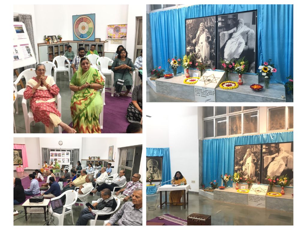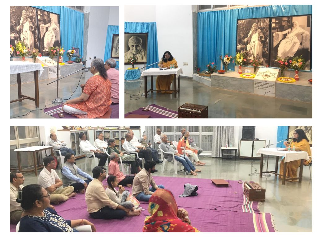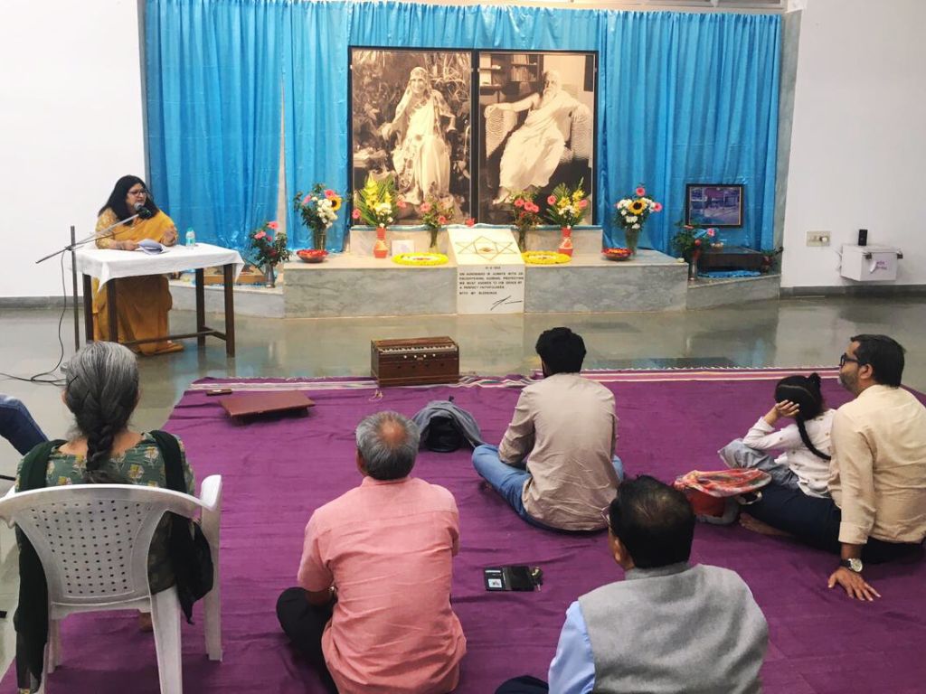 The evening began with a musical invocation to the Mother followed by singing of a couple of bhajans by the sadhaks. Dr. Mehra was invited to then present her talk on the selected topic. Dr. Mehra chose to speak in a combination of English and Hindi given the audience preference.